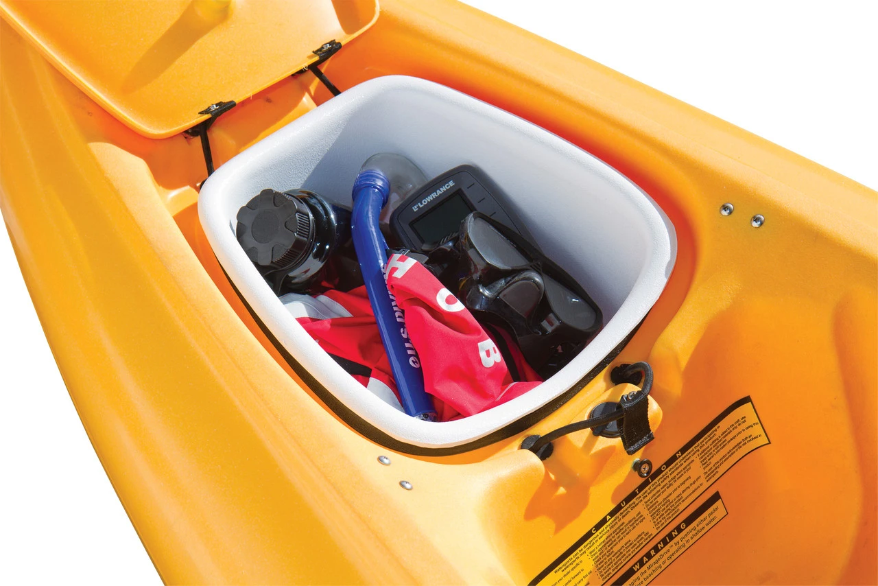 For Hobie Mirage Outback, Revolution and Quest. The forward hatch liner is a space to store gear or fish just inside the forward hatch lid. Keeps items from sliding forward or back inside the hull and keeps them up off the bilge. Now available for the Hobie Outback, Revolution 11 / 13 and Quest 11 / 13 (2013+).