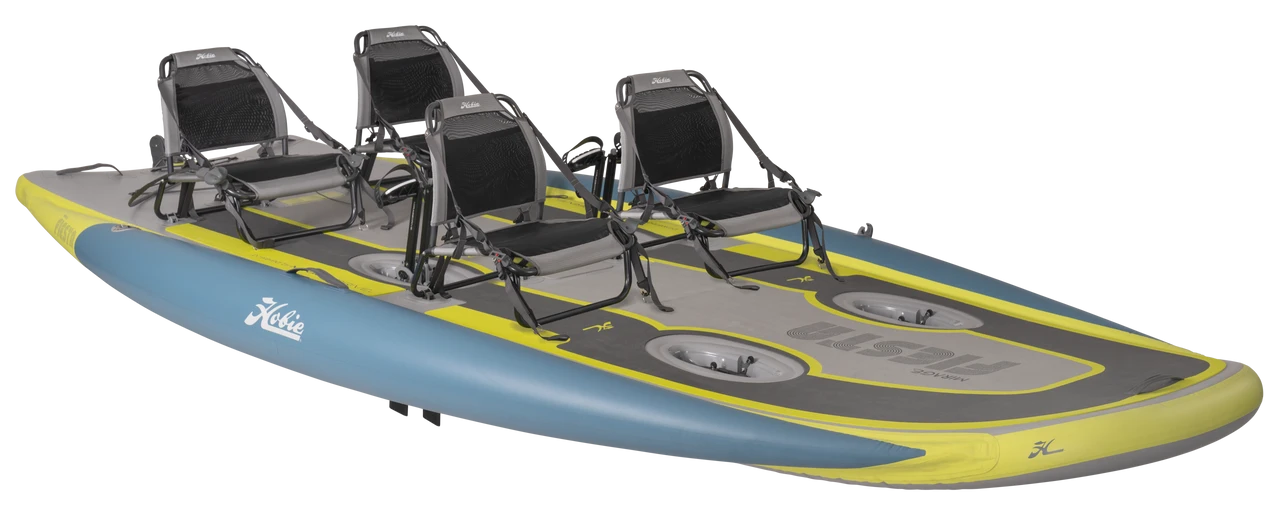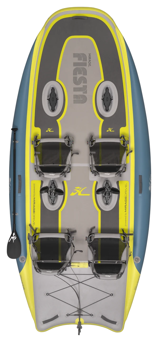 If you’re looking to have some serious fun on your next family outing, look no further than the all-new Mirage iTrek Fiesta that will be arriving in early 2022. This one of a kind kayak is equipped with four comfortable seats, one easy-to-use steering system and powered by two MirageDrives with Glide Technology and Kick-Up Fins. But if you want even more power, you can easily upgrade and add two more MirageDrives with GT, delivering even greater speed and maneuverability. The Fiesta is the most unique watercraft on the market today. Its high-tech, 550 denier, triple-chamber construction delivers the same stability and rugged rigidity as a solid boat, but in a lighter package. The Mirage Fiesta is fast and a party on the water – but we didn’t stop there. It’s versatile, too. Simply turn the front two seats to face the back for integrated social seating, making it the perfect watercraft for spending time on the water playing games or putting your feet up and hanging out. A three-piece SUP paddle, high-pressure hand pump, high-volume electric pump and storage bag are all included along with the four seats and two MirageDrives with Glide Technology + Kick-Up Fins. Let’s get this party started!